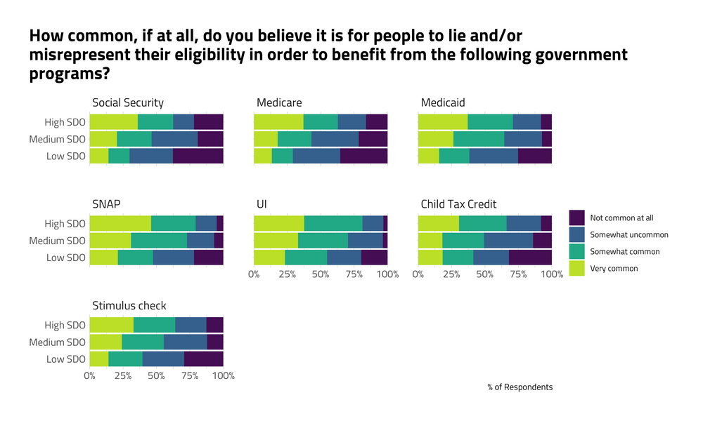 The breakdown by SDO score is shown below. Respondents high in SDO are much more likely to believe there’s widespread fraud, and this is true across all the social safety net programs we asked about. The effect size is also larger.