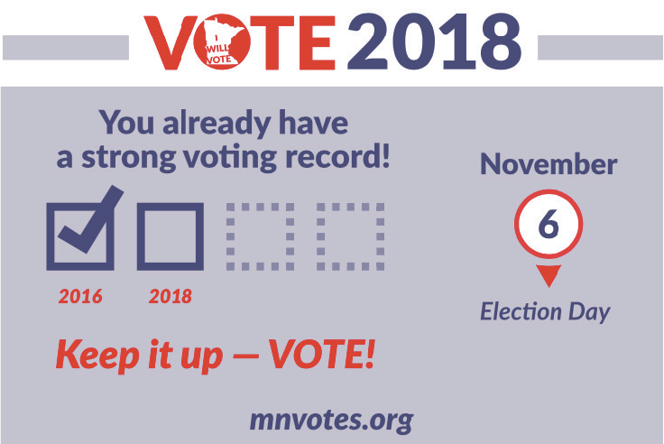 In Minnesota, we partnered with the office of the Secretary of State to develop solutions to increase turnout for “drop-off voters” (those who only vote in presidential elections) and other occasional voters. Our goal was to help more people develop a consistent habit of voting. We knew state administrators could be an important channel for this type of voter outreach since they are a trusted source for official information and already have a number of touchpoints with potential voters. Leveraging the power of this channel, we designed and tested simple postcards that addressed key barriers occasional voters may face: an incorrect mental model of what it means to be a good voter, lack of accountability for voting, and a lack of a strong voter identity. Our strongest intervention used positive social pressure to increase turnout by nearly 0.5 percentage points, or about 860 more votes in our sample size.