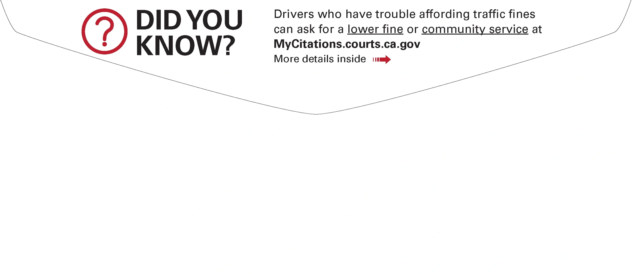 In California, traffic citations can cost hundreds of dollars. These large fines create billions in debt and hit low-income drivers the hardest. To address this, the state launched MyCitations, an online system that allows people to request income-based reductions to their fines based on ability to pay. We partnered with Tulare County Superior Court to increase usage of this program and also timely response to citation deadlines, which were costing 29% of ticketed drivers additional penalties of up to $300, suspended licenses, and debt collection.