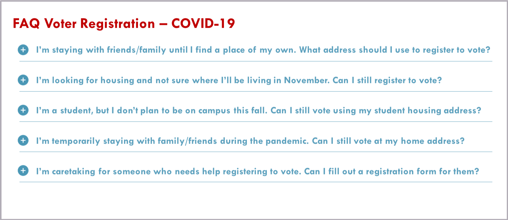 Update all guidance on voter registration FAQ pages to reflect the instability people are experiencing during the pandemic. COVID-19 has created increased housing insecurity and broader uncertainty for many Americans, including students who are unsure if they will be living