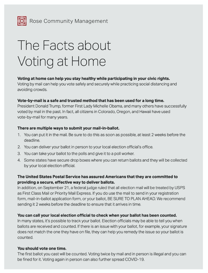 Frame around facts: The one-pager combats multiple myths about voting by mail by building the readers’ understanding of truths.